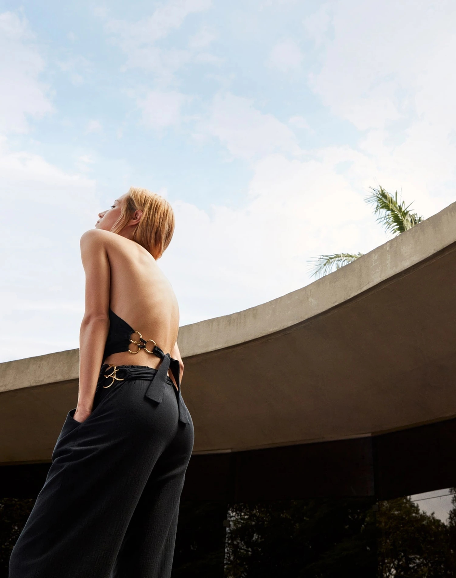 Epitomize class and style in the sexy Ava Blouse – a low back halter top shaped in a lightweight linen fabric that is brought to life with a stunning gold- plated ring trio trim; a knockout piece that brings out your inner fashionista.
