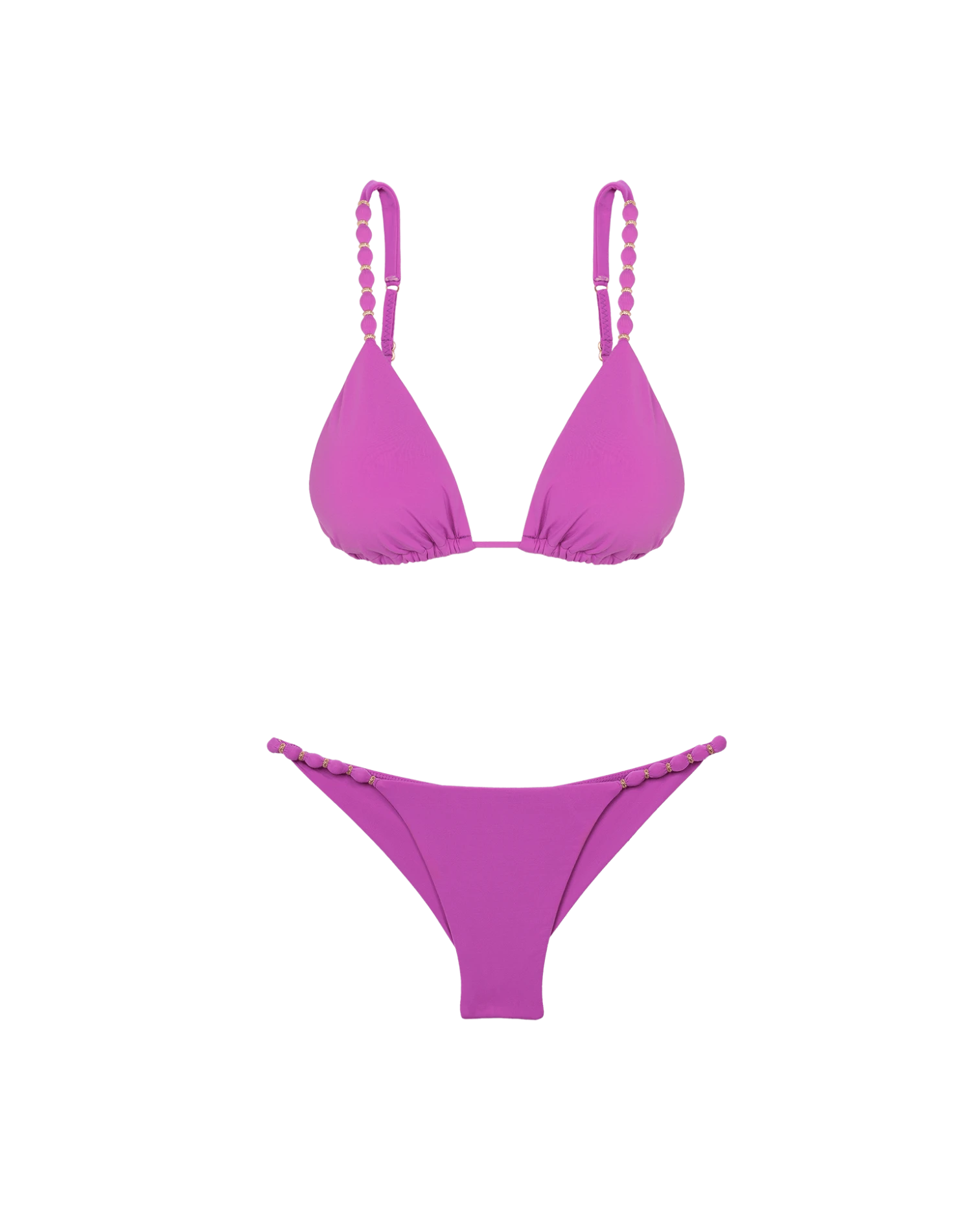 This triangle top is going to set you apart from the rest! With its hand-crafted fabric beading and gold accents you will be the talk of the pool.