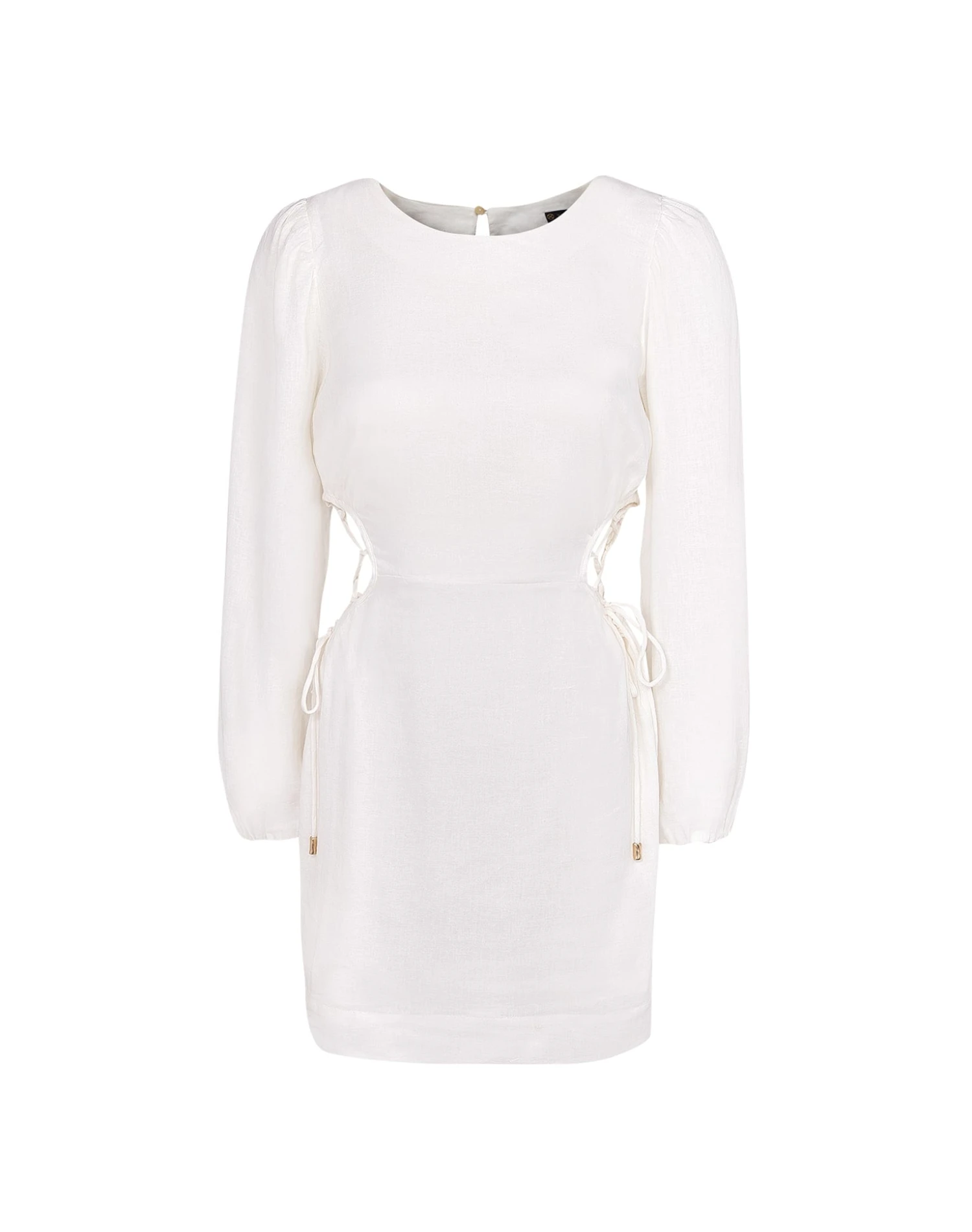 Experience the power of elevated simplicity in the Carina Short Dress; a heightened mini dress that will make a statement anywhere you showcase this piece. Designed in a lightweight linen blend bodice with a sultry waist cut-out and 24k gold caps at ties that adjust to your liking for the perfect curve-enhancing fit.