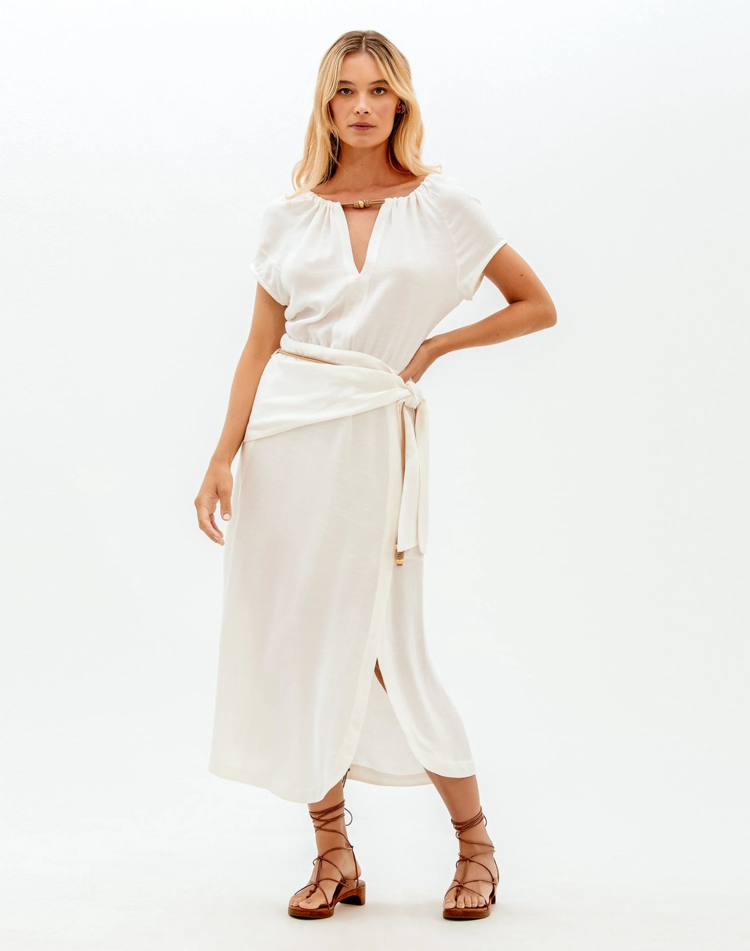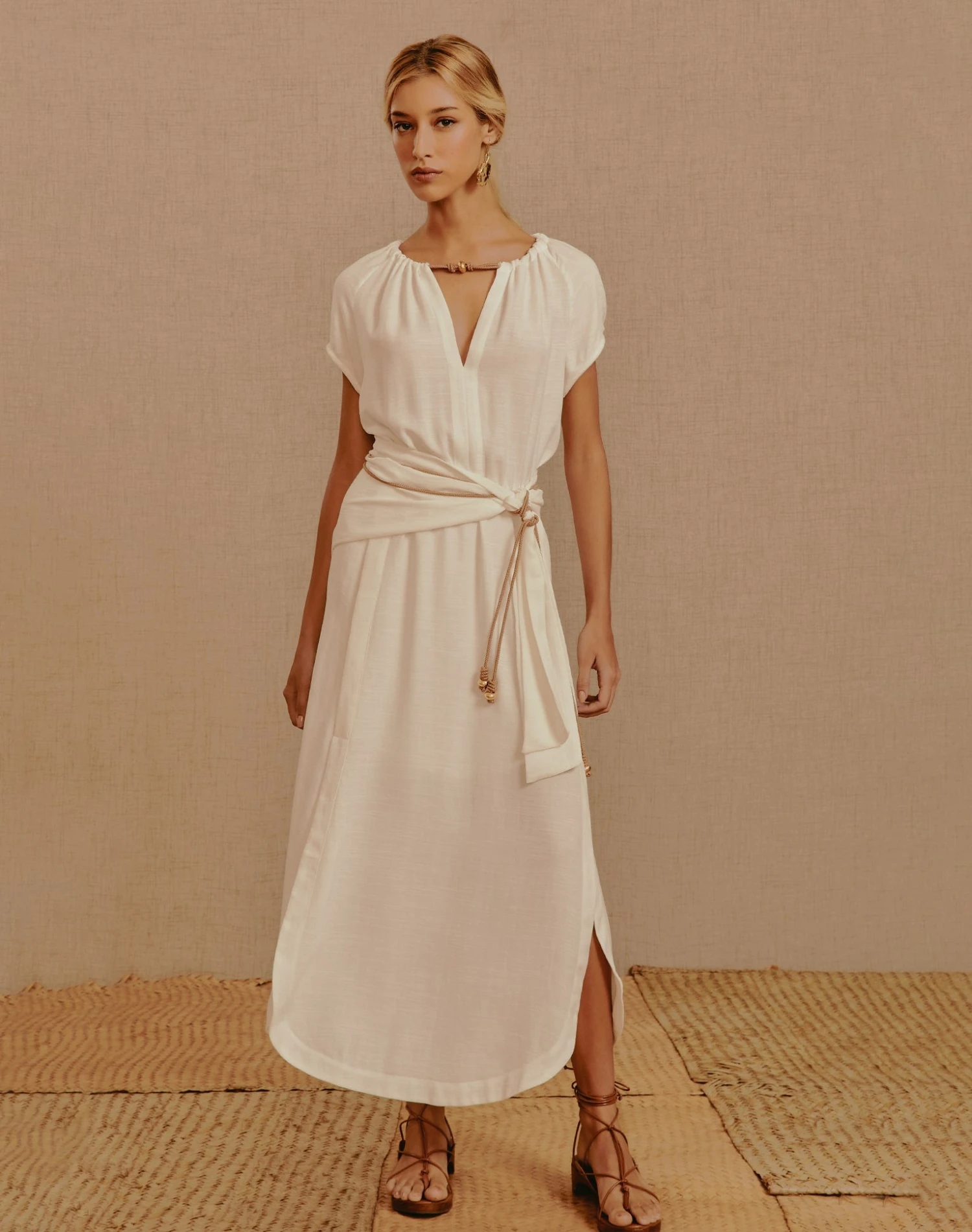 Make your getaway memorable with the Claire Midi Dress. A bohemian flair silhouette with daintily embellished stretchy rope-like cord knotting and gold accents. A classic piece with a touch of sass.
