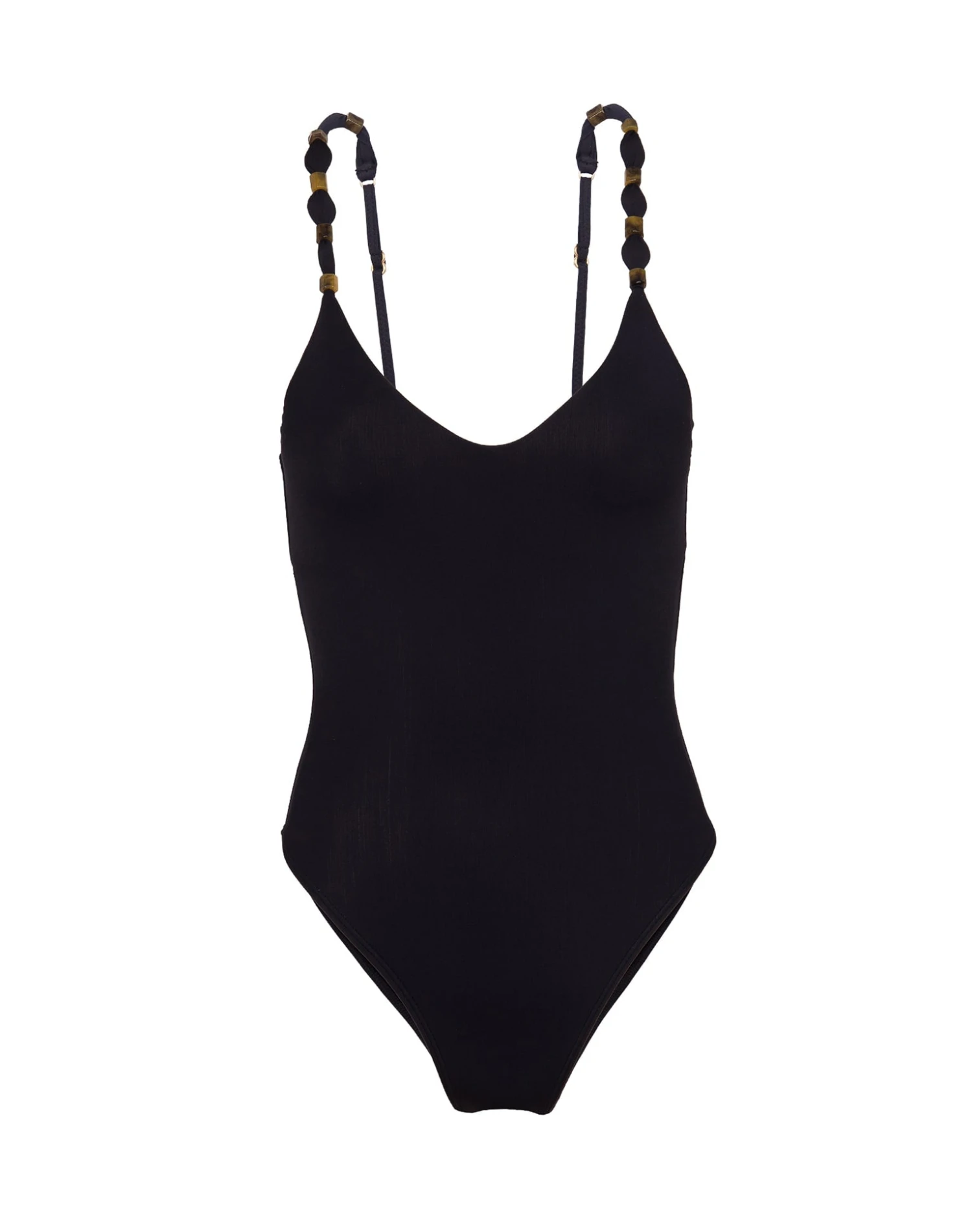 Seas the day in a one-piece. This versatile style will keep you in style from dawn to dusk. Crafted in our exclusive Brasilian lycra and embellished with hand-crafted fabric oval appliqués and tortoiseshell resin accents on straps that will have you engulfed in sophisticated glamour.