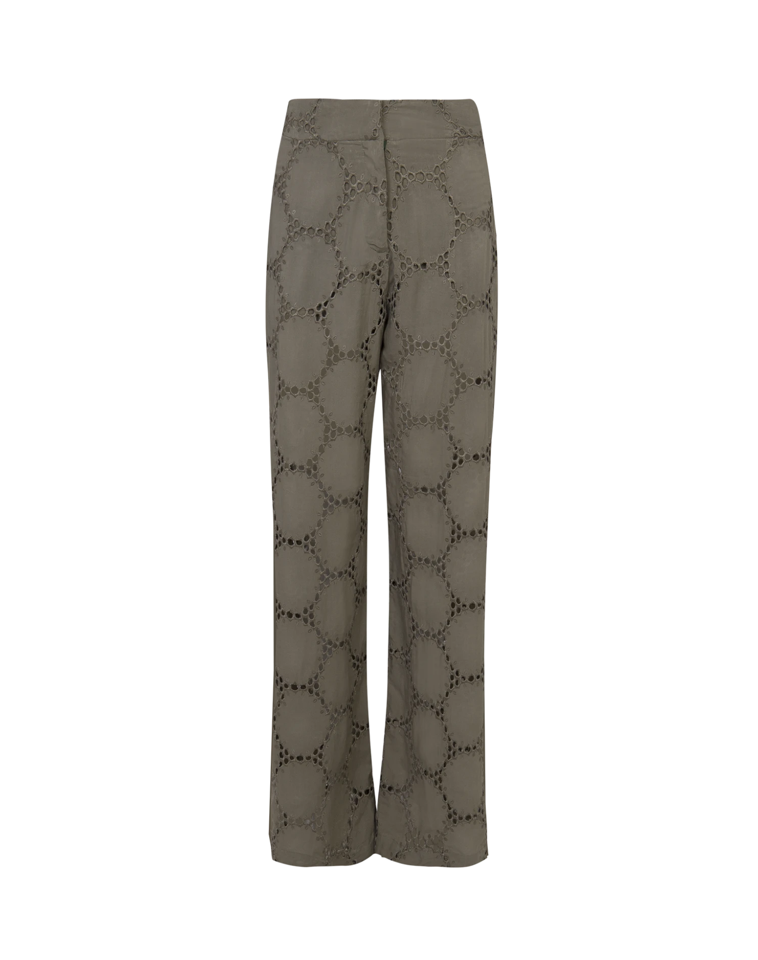 Tailored trousers in a exclusive eyelet fabric, straight leg but with a slightly open hen and knife pocket. A sophisticated and wildcard piece to compose several looks.