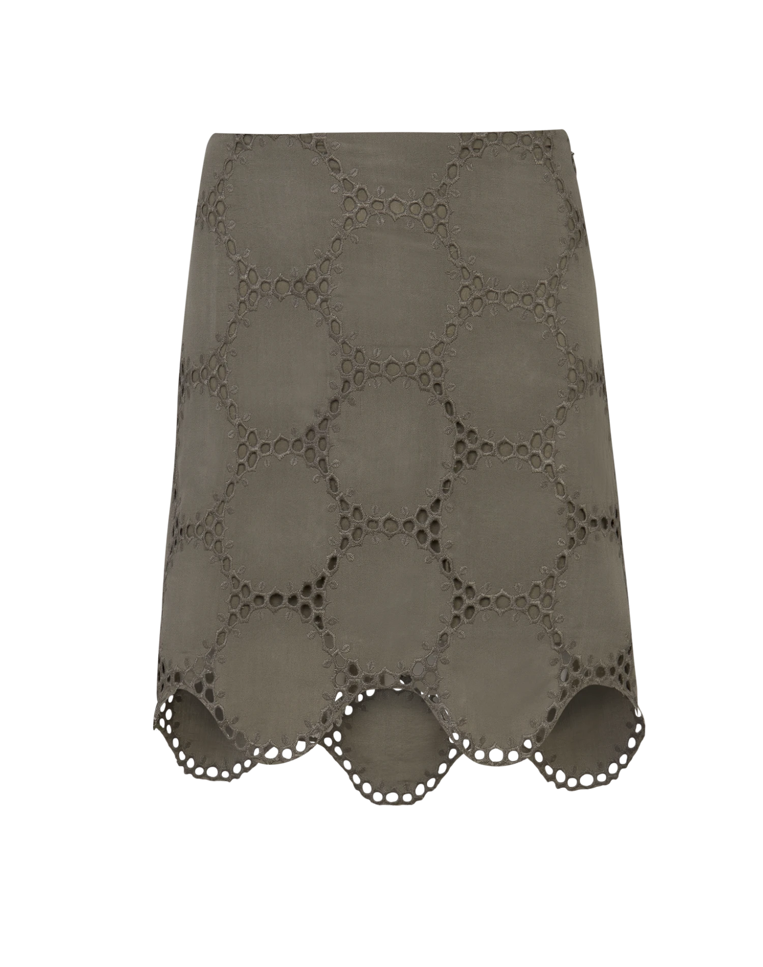 Mini skirtin a sophisticated eyelet style, with an asymmetric hem accompanying the rounded designs. Shorter lining, leaving that mesh effect contrasting with the skin. No waistband, with invisible zipper. A timeless piece.
