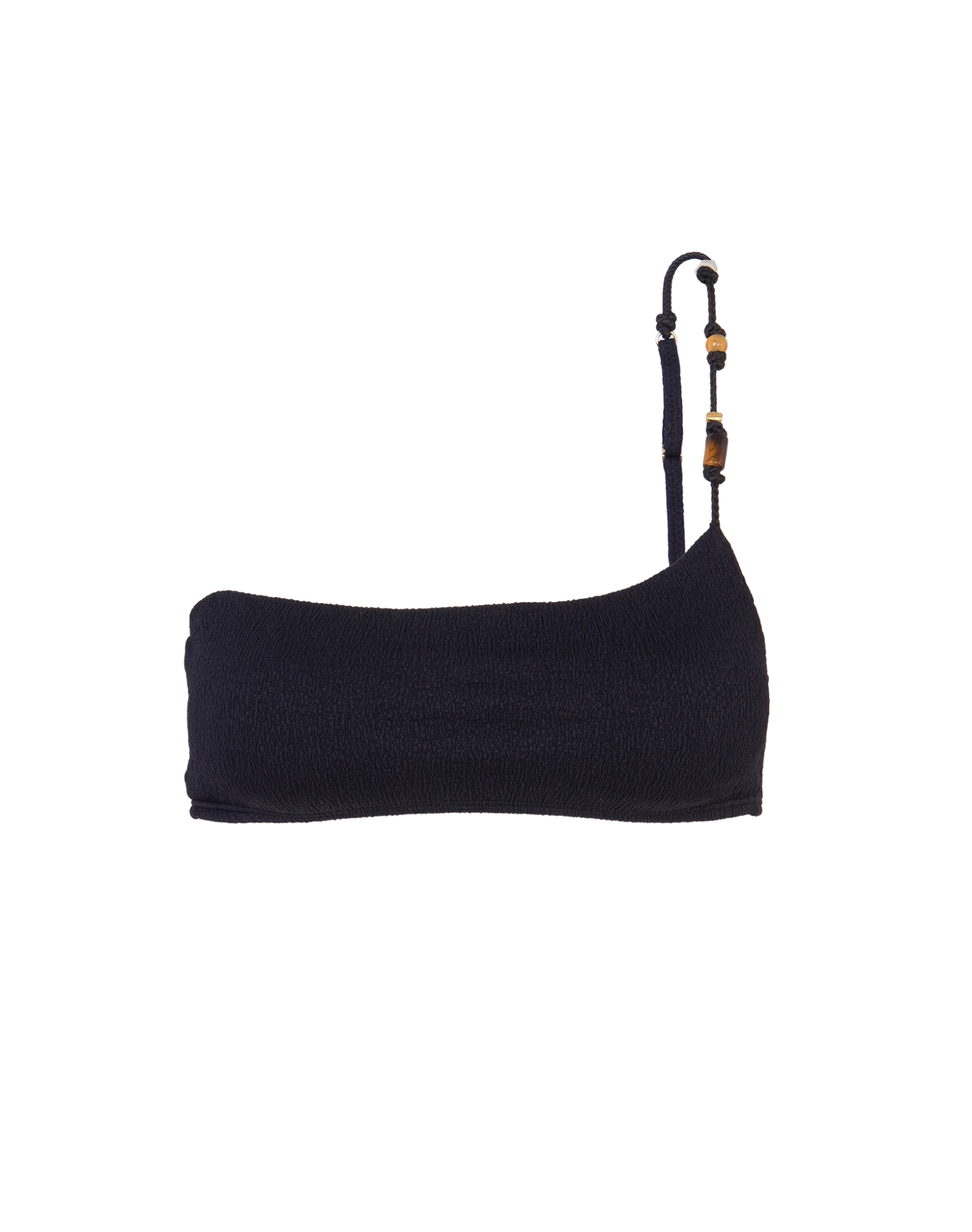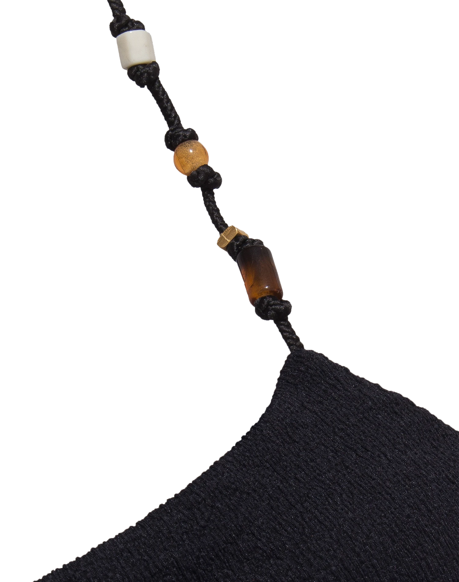 One-shoulder adjustable top, finished with tortoiseshell resin and metal details, arranged in elastic cord the same color as the fabric.