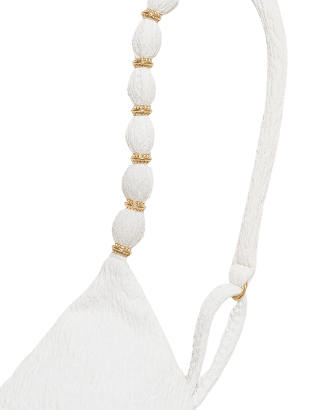This triangle top is going to set you apart from the rest! With its hand-crafted fabric beading and gold accents you will be the talk of the pool.