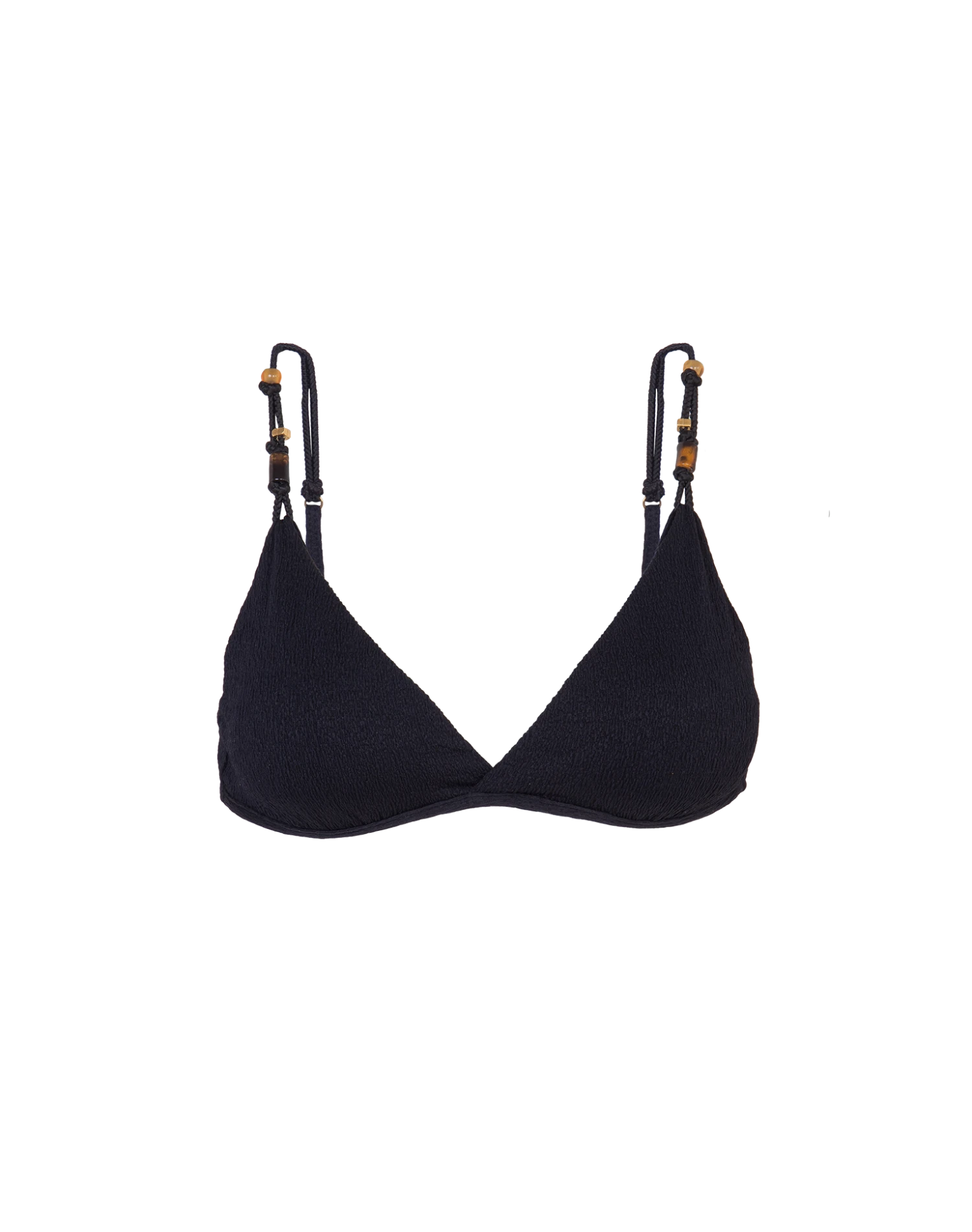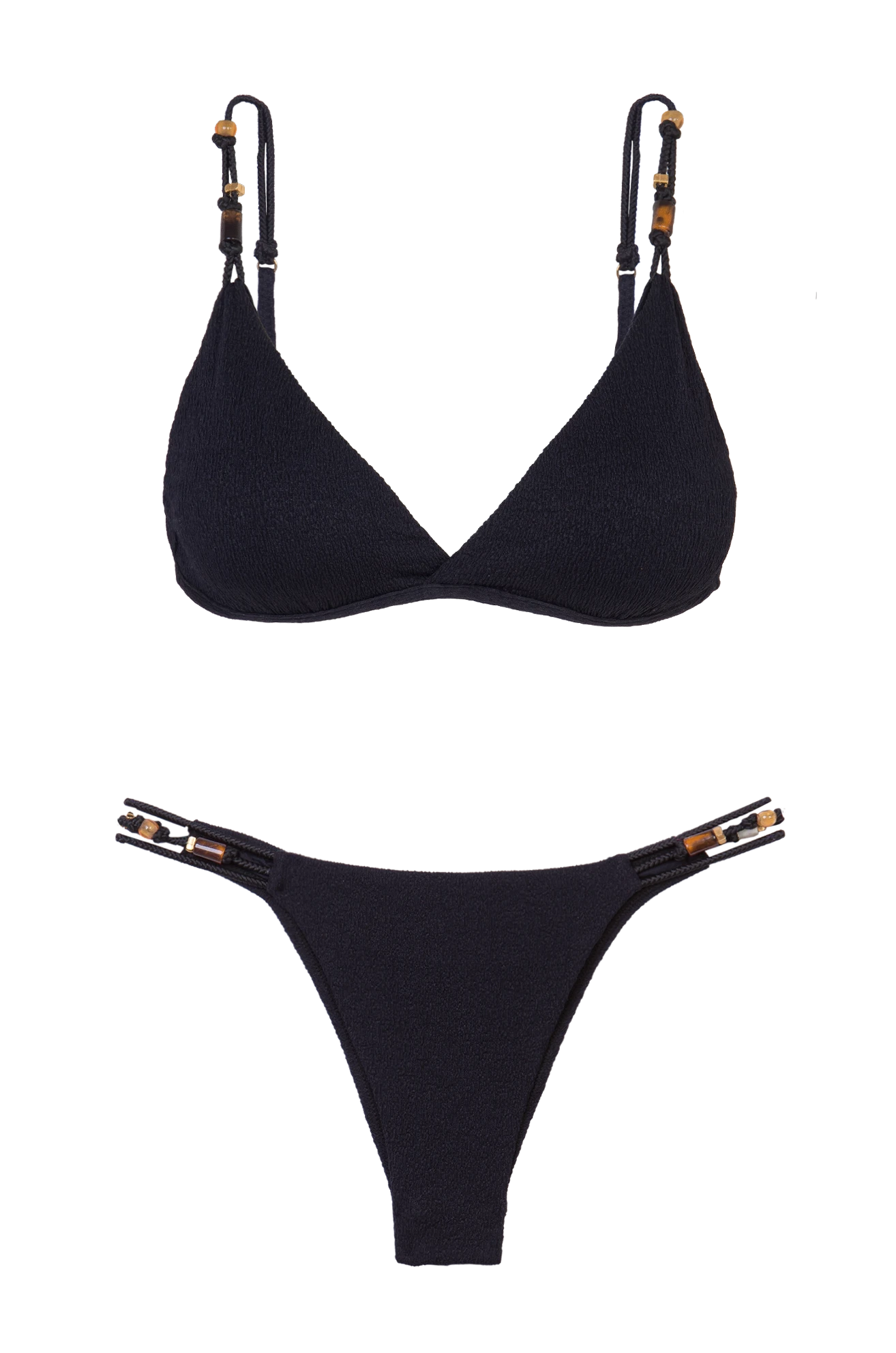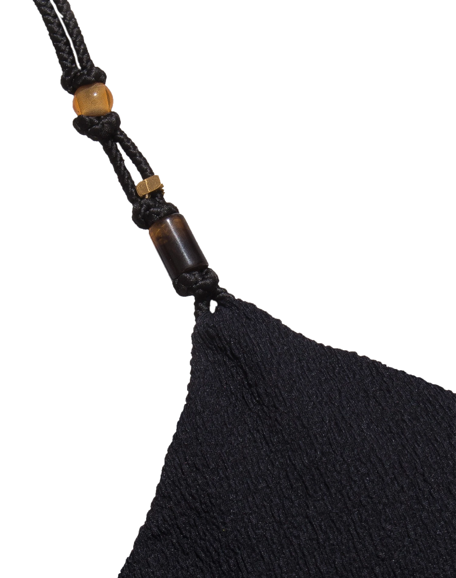 Full top with detail on the straps. Parallel adjustable straps, finished off with tortoiseshell resin and metal details, arranged in elastic rope in the same color as the fabric.
