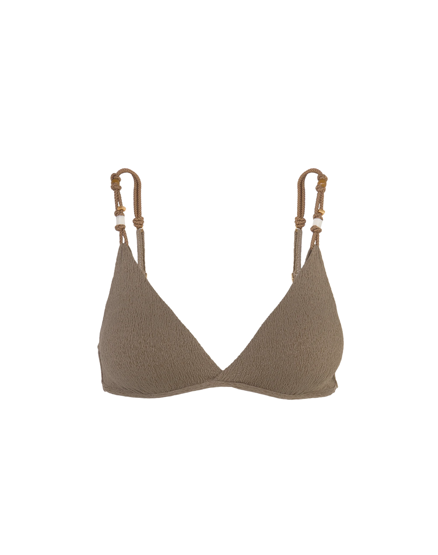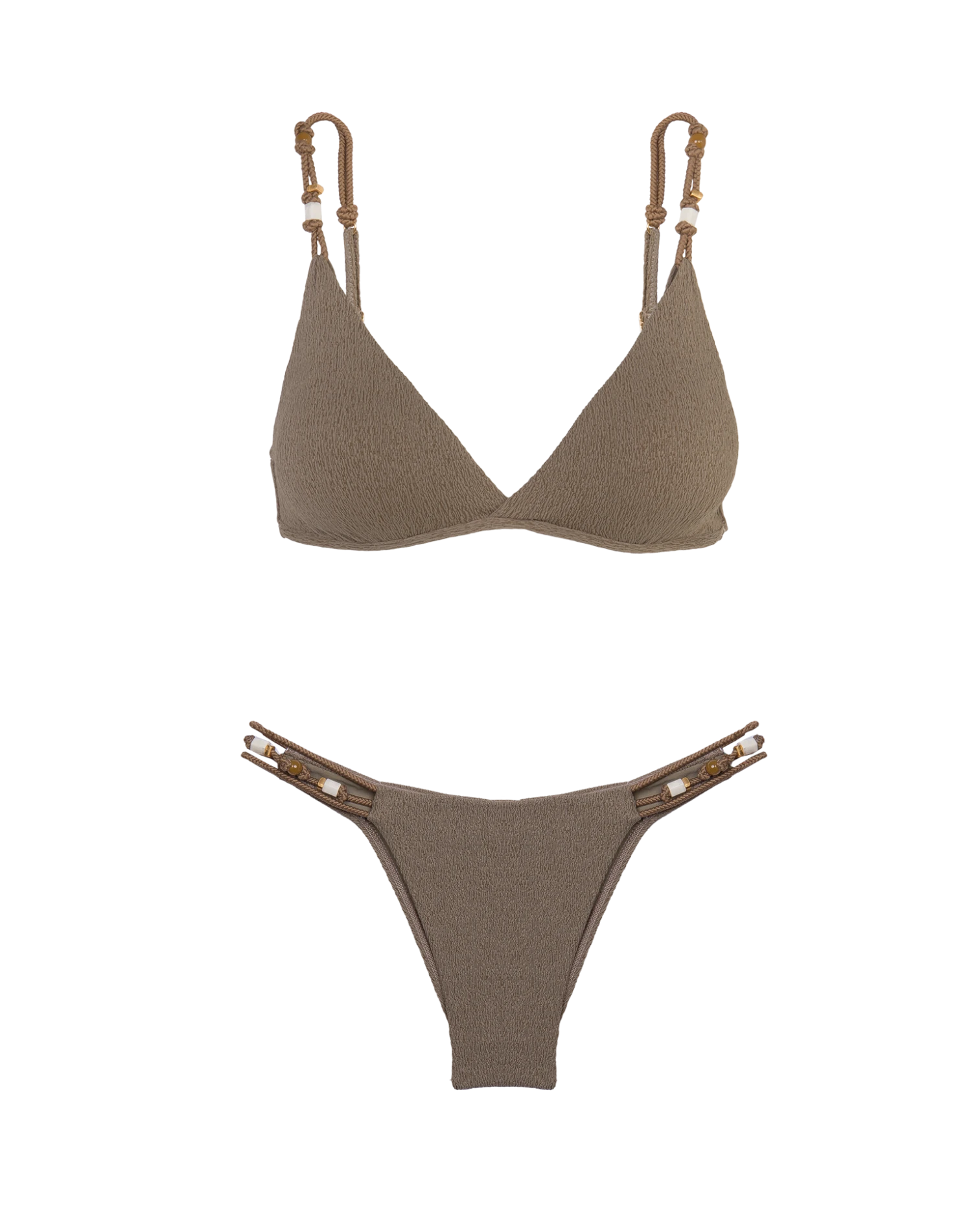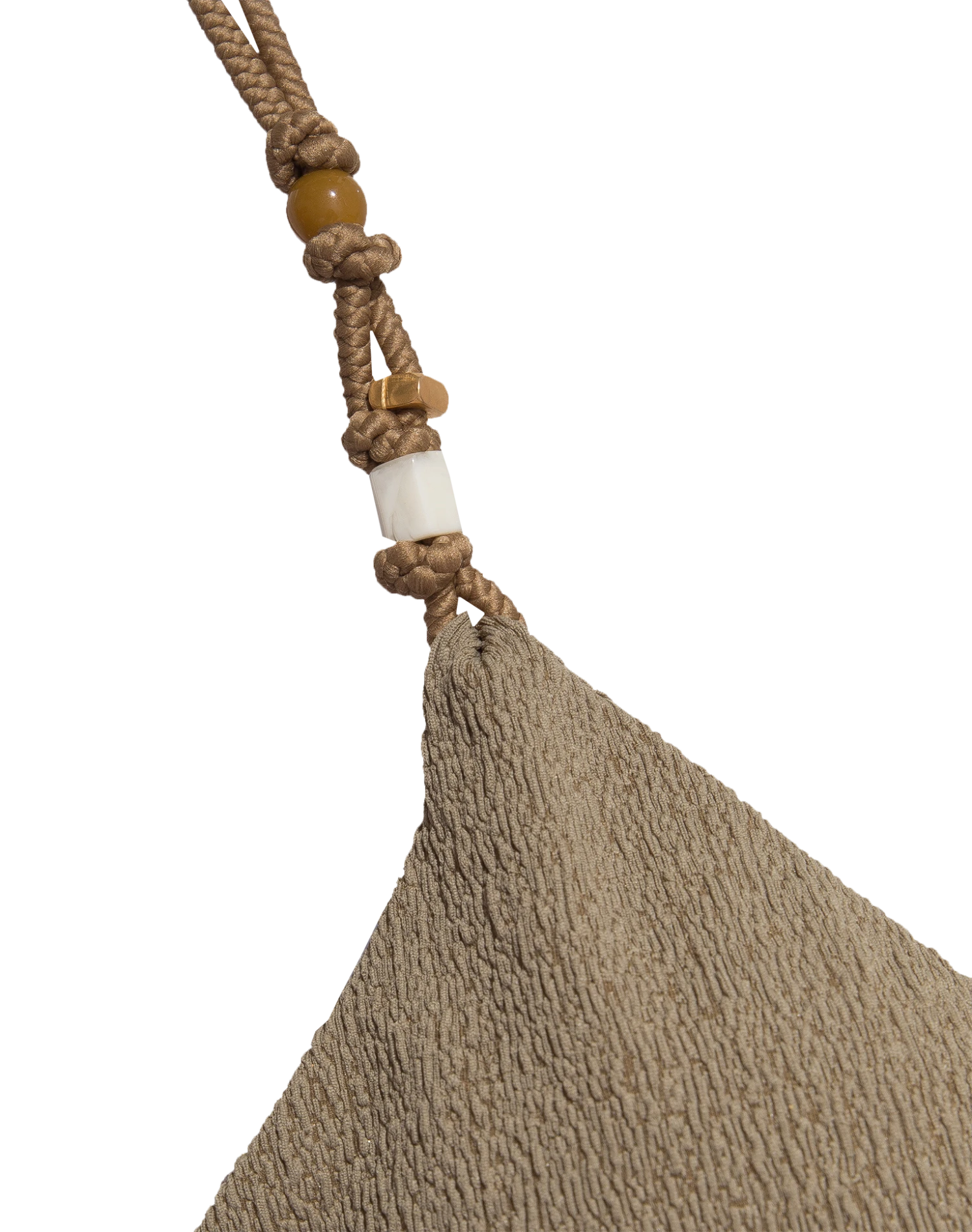 Full top with detail on the straps. Parallel adjustable straps, finished off with tortoiseshell resin and metal details, arranged in elastic rope in the same color as the fabric.