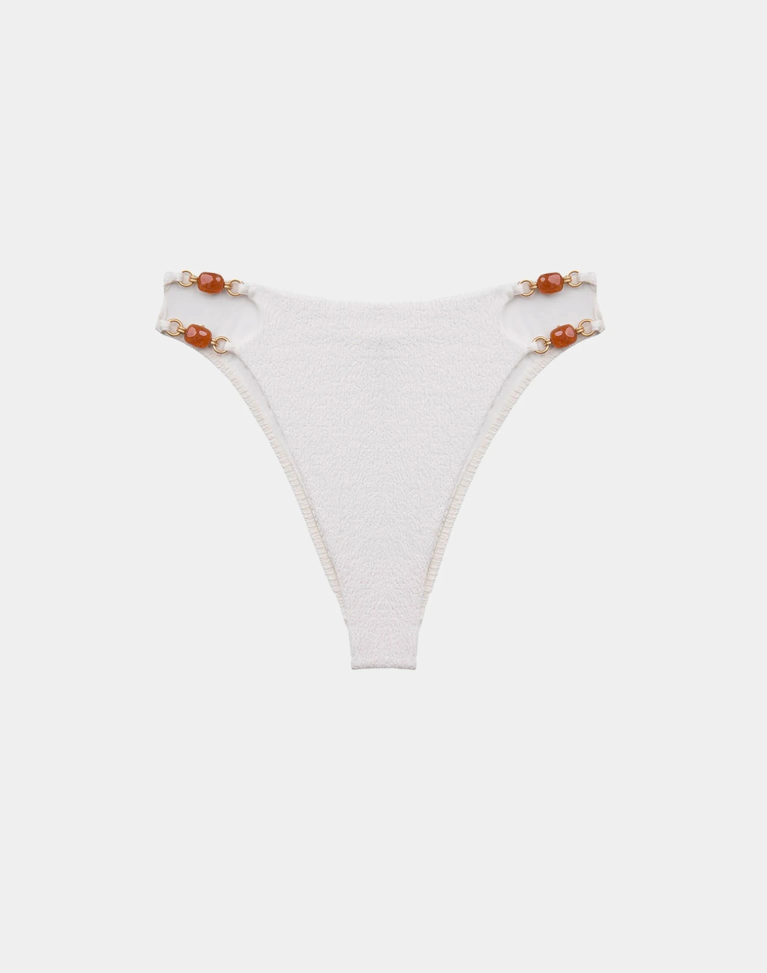 A sun craving french cut classic that promises to enhance your silhouette while keeping you styled to the nines. Designed to flatter, the Martha Hot Pant features a high-rise bodice that accentuates your waistline and is artisanally embellished with colorful stone-like resin and gold rings links constructed to provide you with a distinctive design.