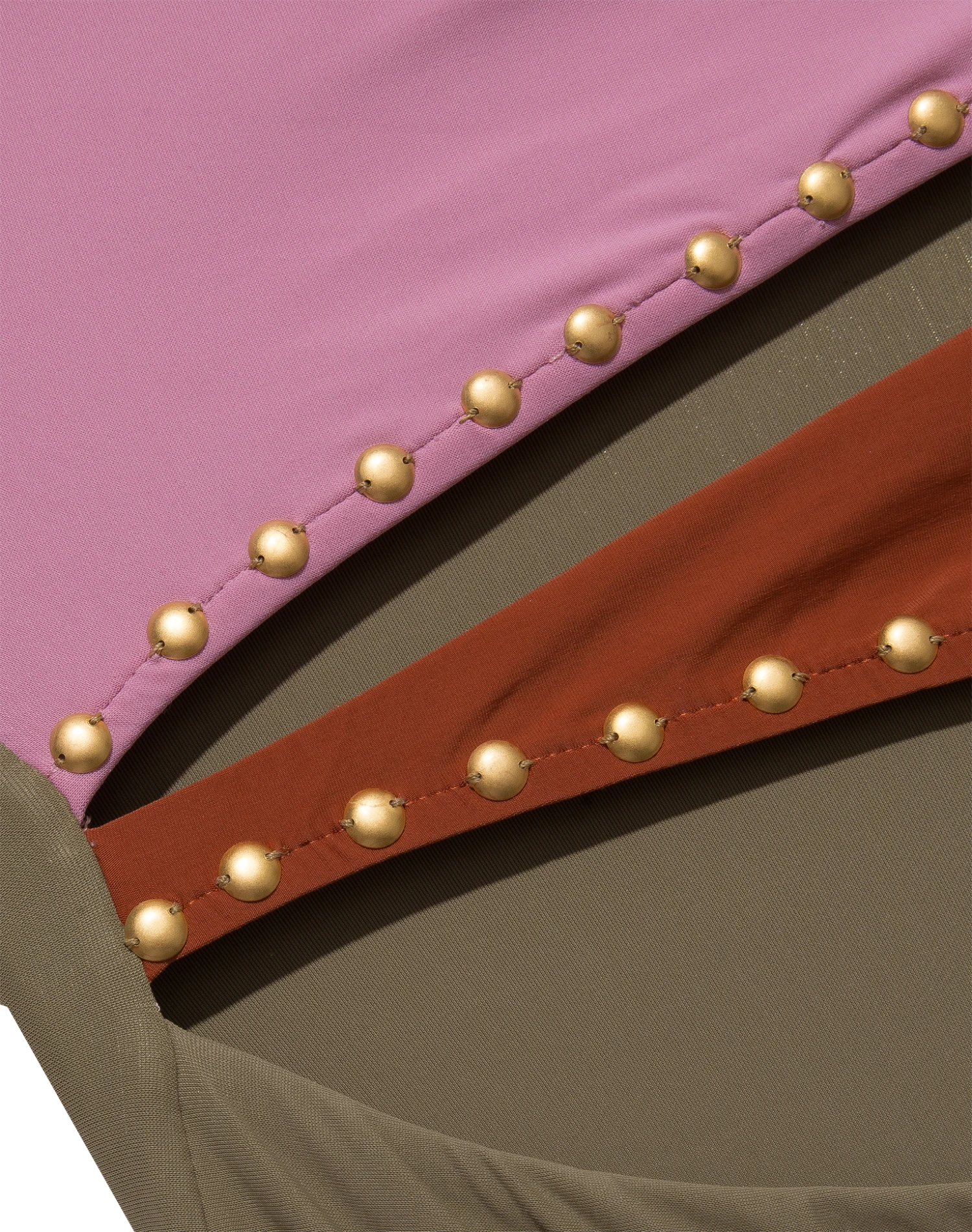 Tri color-blocked one piece in our top colors of the season light pink, deep green, and camel color. Our staple 24k gold studs to accentuate the colors, will have you looking sexy and chic wherever you are out and about.