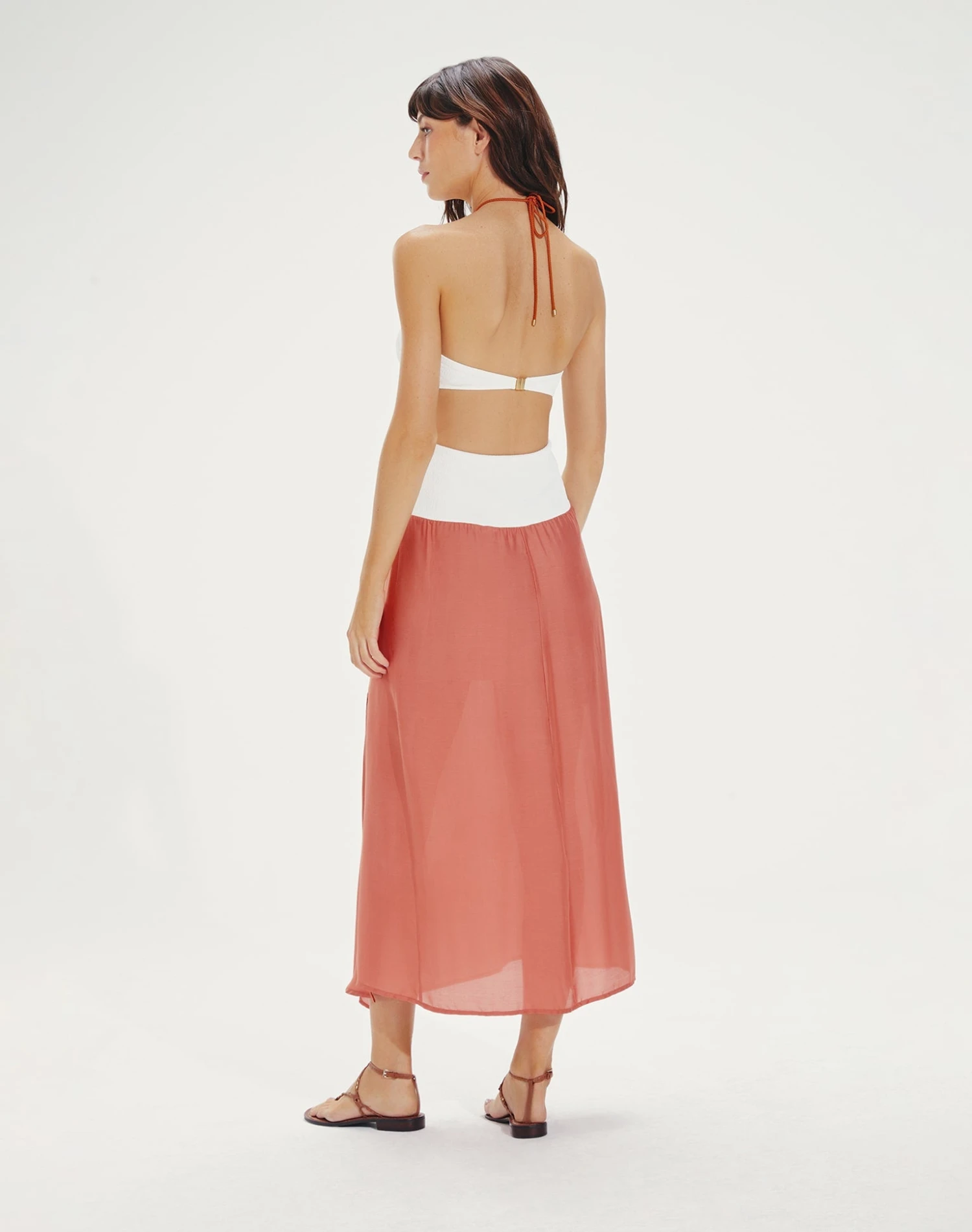Set new trends in this sultry midi length dress featuring a contrasting silhouette, lightweight linen bodice, and a sizzling waist cut-out embellished with hand-crafted 24k gold dipped charms and waxed rope neckties making it the perfect style for a day-to-night outfit that is sure to turn heads.