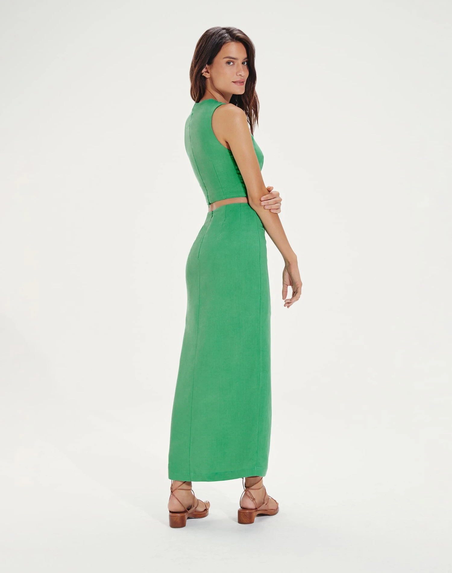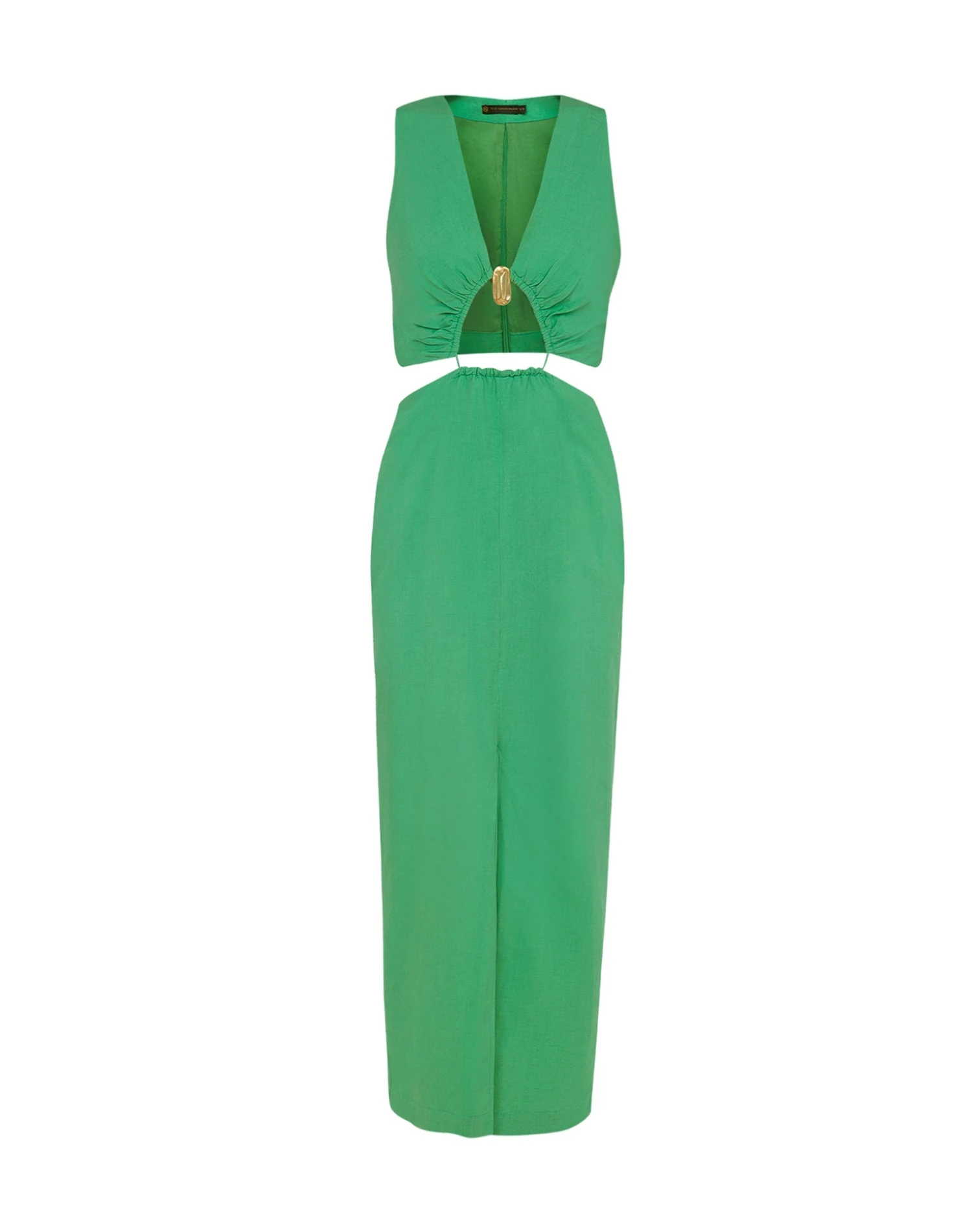 A testament to its name, the Gracie Detail Long Dress embodies the epitome of grace and sophistication. This is a feminine silhouette crafted to make you stand out. Designed in a linen blend fabric, with a sultry waist cut-out, and an added hint of luxury with a crushed gold-plated pendant.