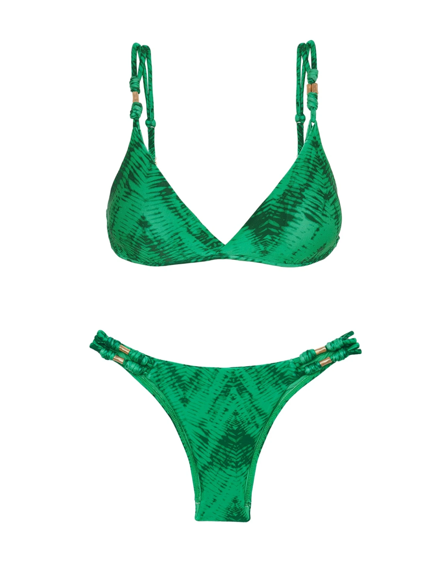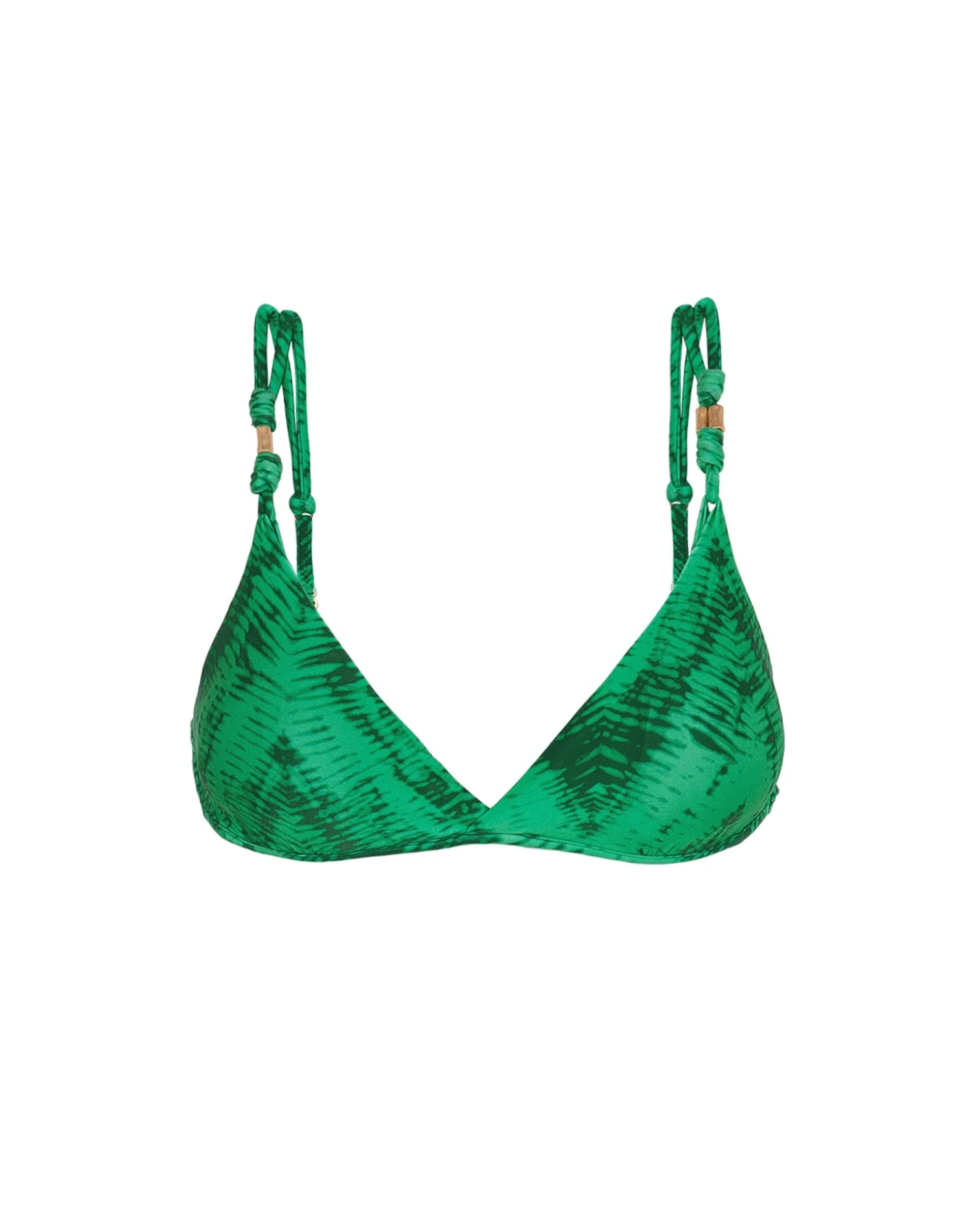 Add some variety to your vacation style with this over-the-shoulder Jaque Kira Top. This unique bralette features a cross-over fabric detail at the neckline, a double shoulder strap embellished with knotted details, and 24k gold accents for a form-fitted confident look.