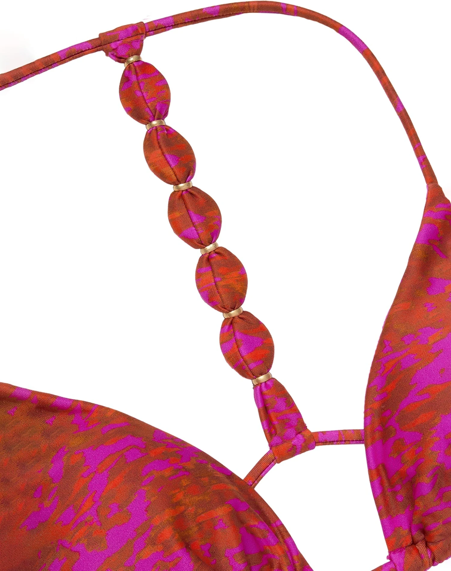 Delight in the details of the Lizzy T Back Top a statement-making design that was made for you to soak up the rays in true luxurious fashion. Curated for sunfilled adventures, this bikini top is shaped in our famous Brasilian lycra and artisanally enhanced with self-covered oval appliqués and complemented with 24k gold charms.