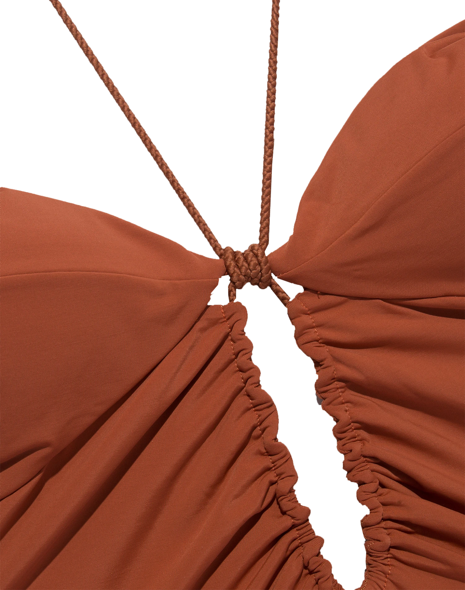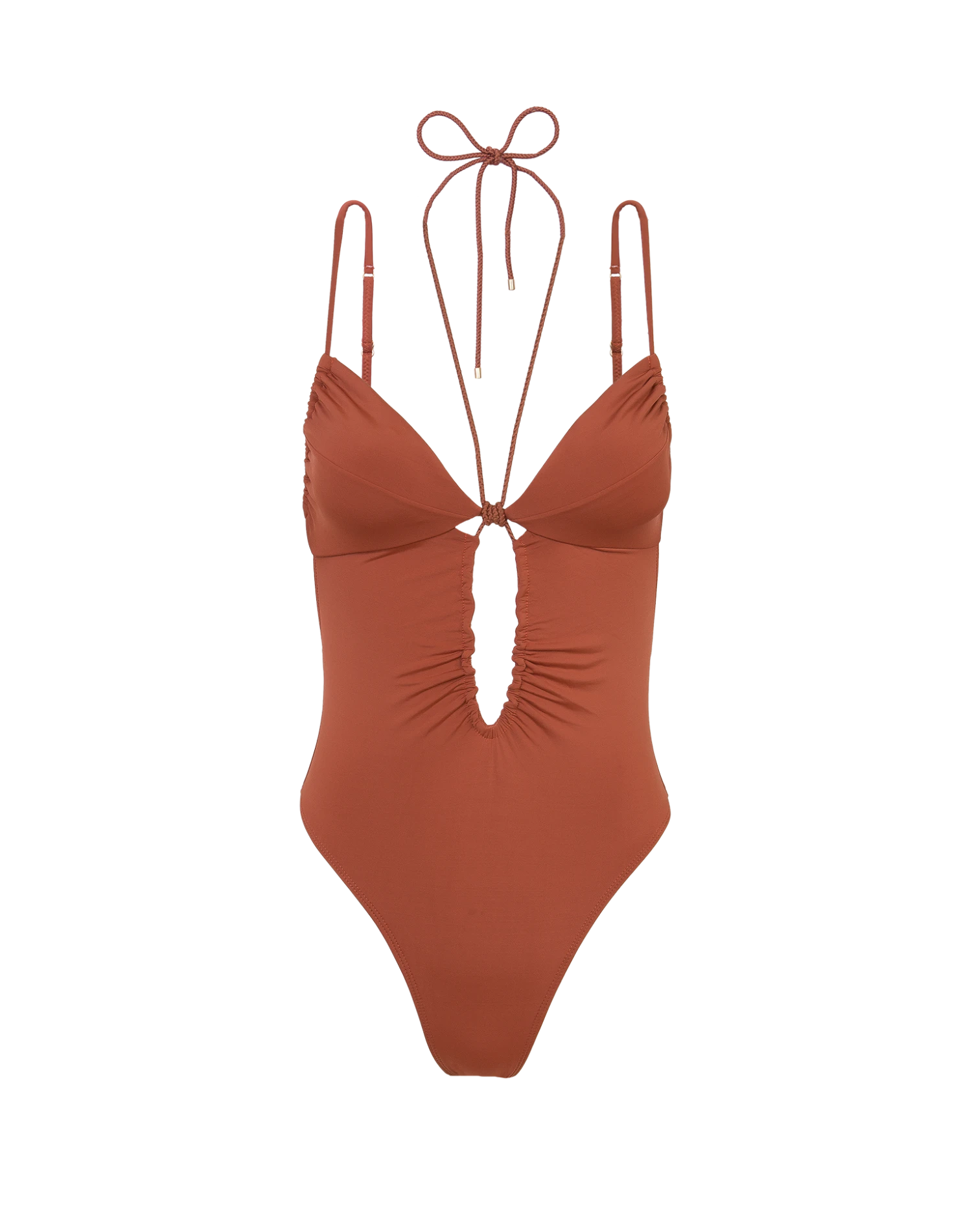 Features a full bodice with front cut out detailing, halter tie, parallel adjustable straps, and a Brasilian cut bottom for medium coverage.