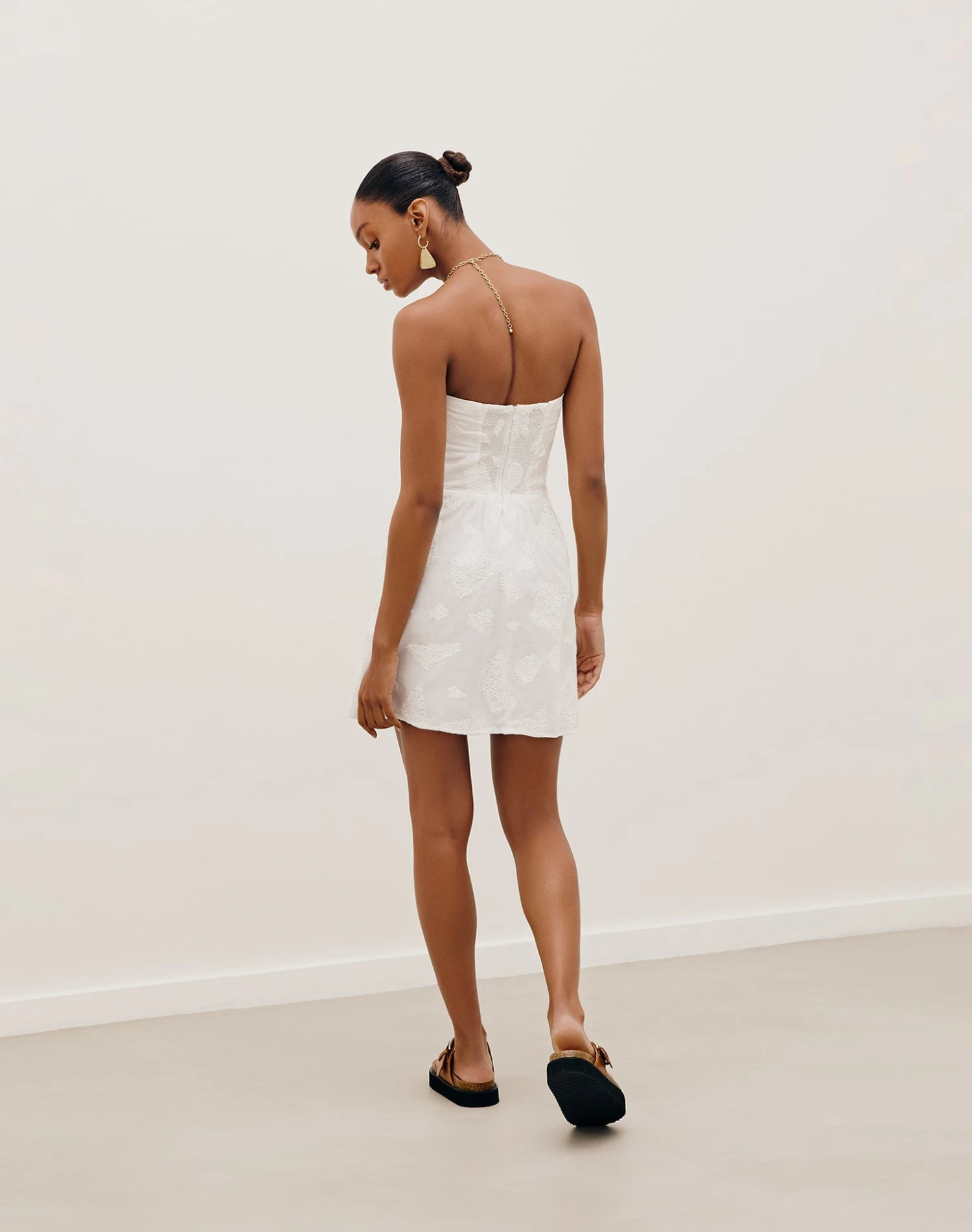 Easy to wear elegance is embodied in the Maureen Short Dress, a glamorous mini that was made for you to indulge in luxury. Shaped in a beautiful lightweight hand-embroidered fabric and embellished with subtle cut-outs below the bust and a showstopping gold-plated chain “U” neckline that will take your style to new heights.