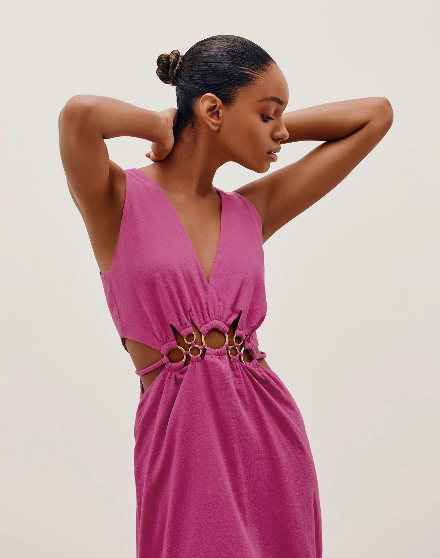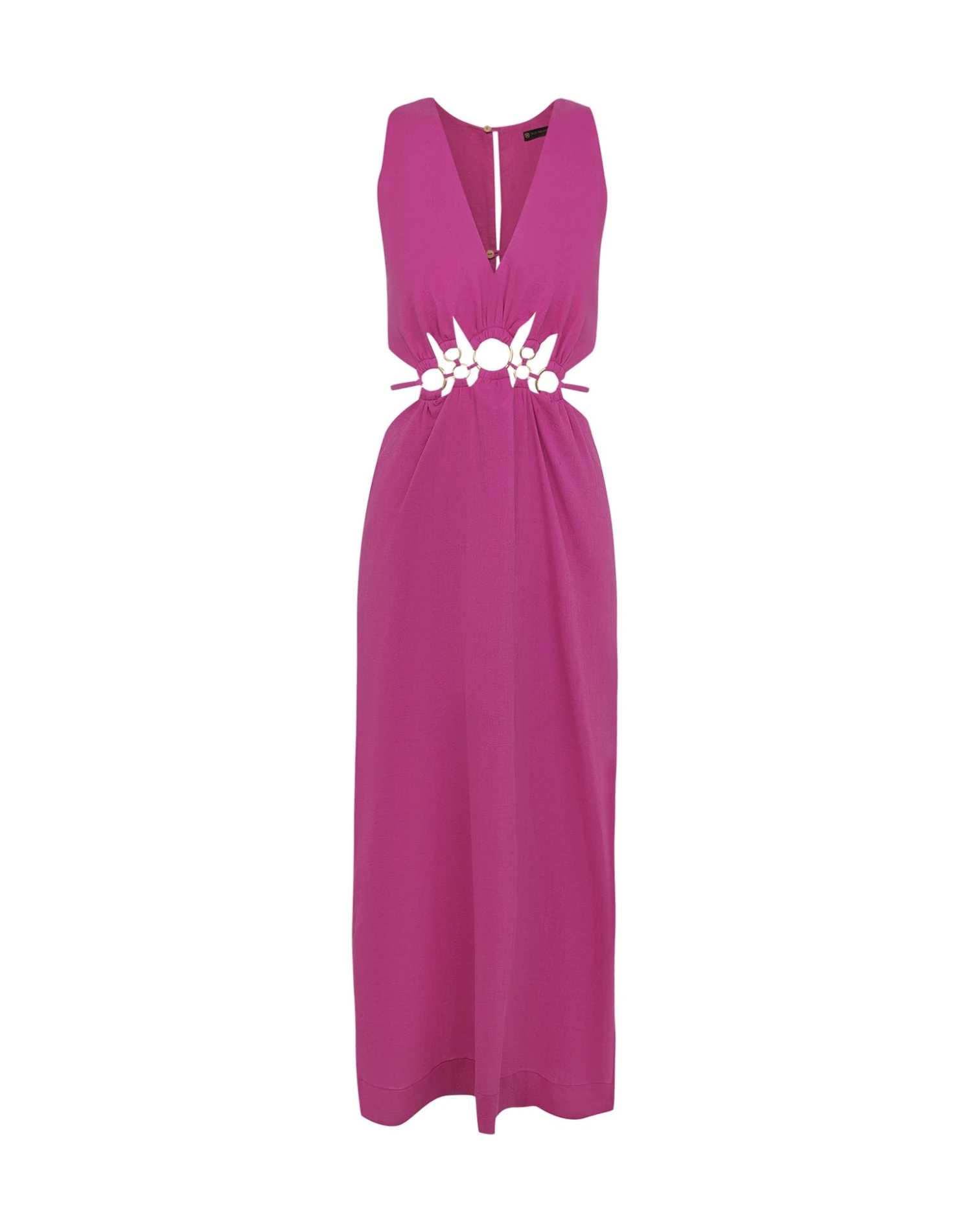 Show off that signature style of yours in the Maya Detail Long Dress, a picture perfect silhouette that will cause a fashion scene anywhere you go. Beautiful, lightweight linen blend fabric shapes this stunning design which features a plunging neckline and eye-catching waist cut-outs embellished with brushed-gold ring details that come together to give you a playful yet sophisticated style.