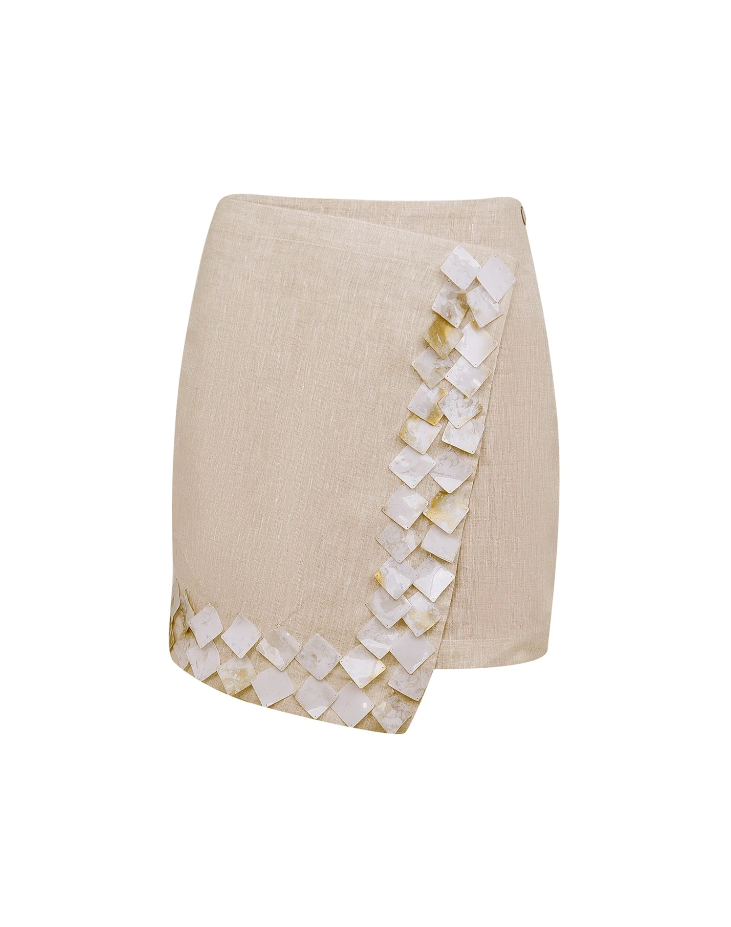 Embrace your femininity in the statement-making Meire Mini Skirt, a sultry yet sophisticated designed to showcase your creativity. Show yourself off in this asymmetric piece fashioned in a linen-blend bodice heightened by artisanally made shell trim, adding a layer of flair to this timeless work of art.