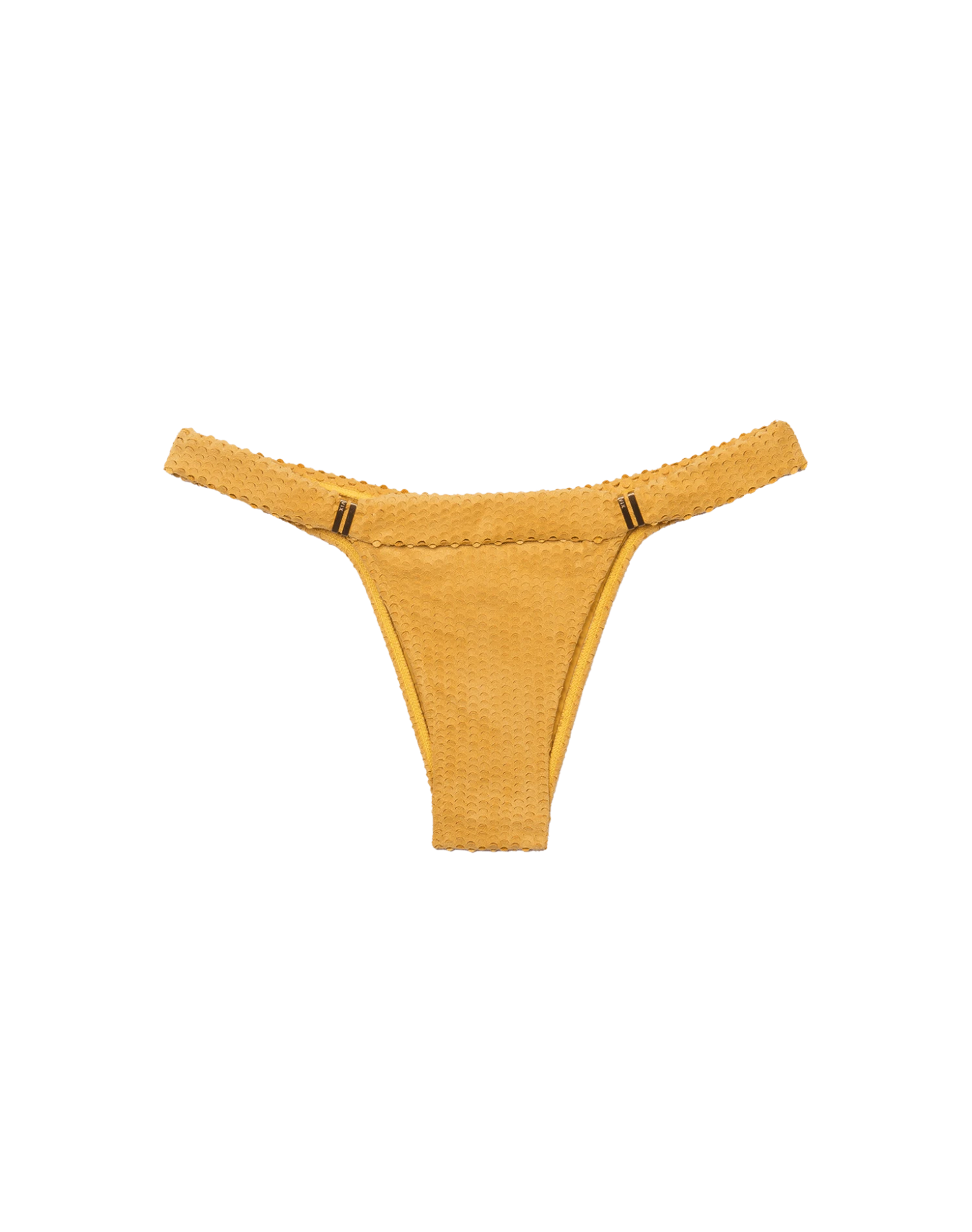 Traditional signature foldover bikini bottom in a handmade watercolor print for added texture and sliding gold hardware for customizable coverage. Ideal for any bodice.