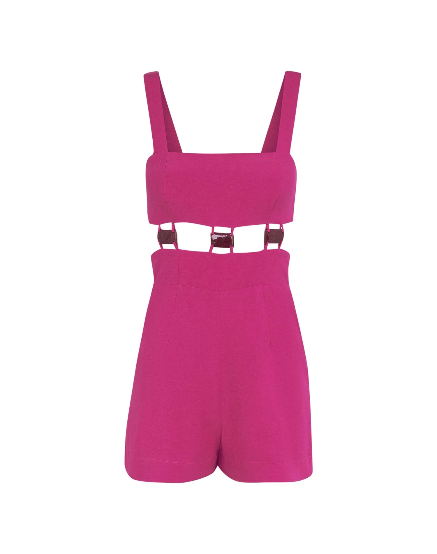 All-in-one fashion has never looked so good as it does in the Tuane Mini Jumper; a statement-making design that will help you achieve an endless-summer look. This riveting romper is crafted in fresh linen blend fabric with a striking waist cut-out artisanally embellished with square amber resin accents, and a short bottom to create an iconic unforgettable attire.